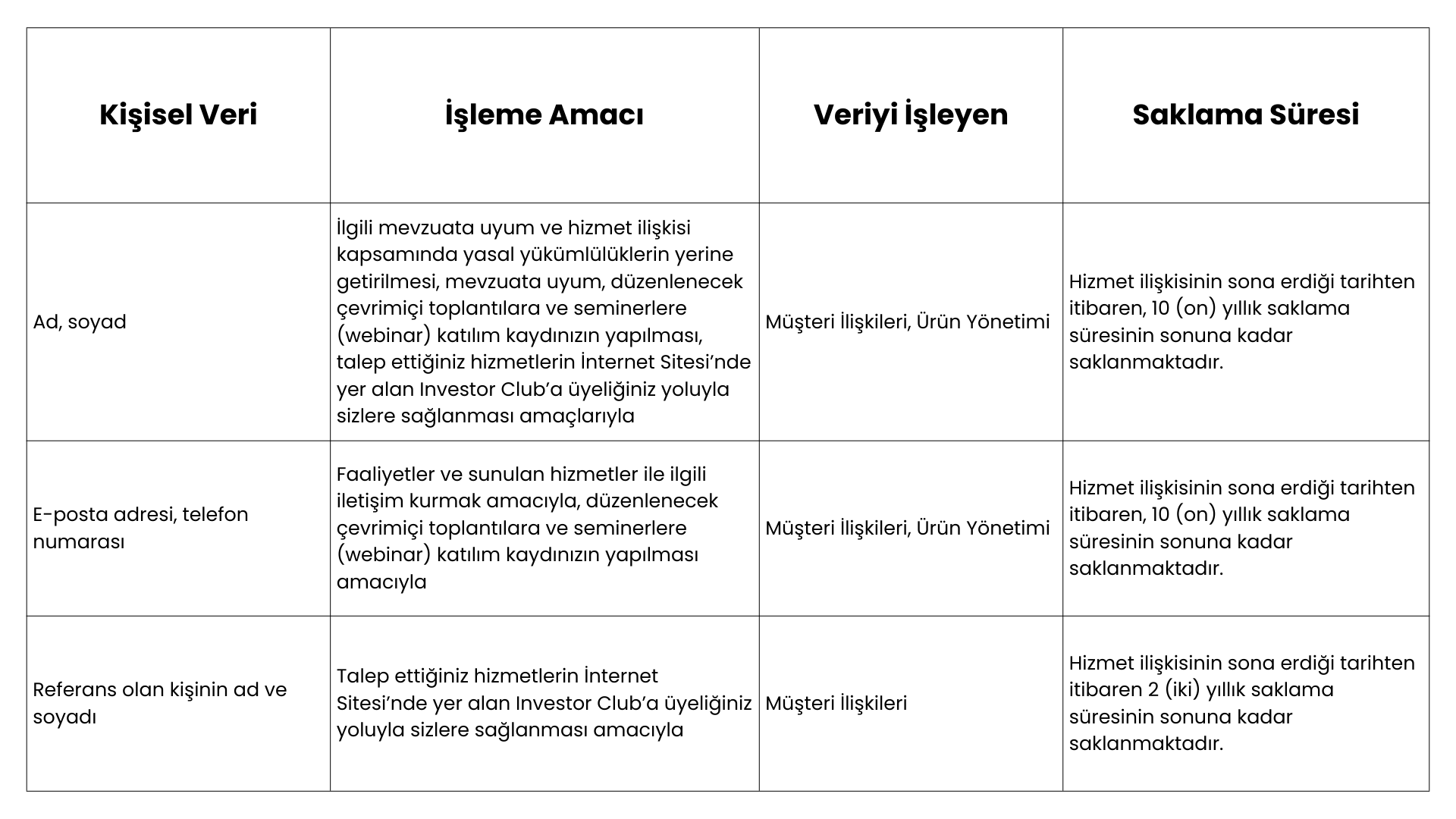 Investor Club. BV Teknoloji, aşağıda tabloda yer alan kişisel verilerinizi belirtilen amaçlarla, belirtilen birimler aracılığıyla ve yine belirtilen sürelerle sınırlı olarak işlemektedir.